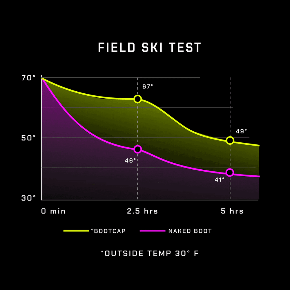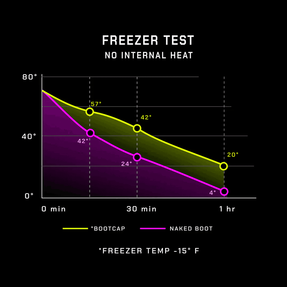 We took a pair of ski boots, fitted one boot with °bootcap® and left the other “naked”. Digital thermometers were taped inside the liner of each ski boot in the toe area, then we stuffed identical towels into the top of each boot to simulate a skiers’ lower leg. Without any type of heat source added to the boots, the initial measurements read 71°F (room temperature). Then we placed both boots in a -15°F freezer and took temperature readings every five minutes for one hour. As expected, the temperature of both boots dropped, but the boot equipped with °bootcap® stayed an average of 15°F warmer.